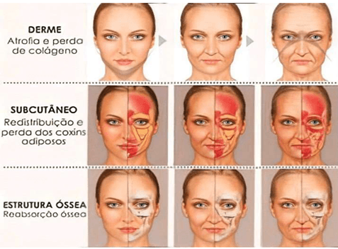 O envelhecimento se dá em todas as camadas da face, desde a pele, como musculatura e ossos. Com o passar dos anos, a pele perde colágeno e elastina, resultando em flacidez, linhas de expressão e perda de volume em áreas como bochechas, lábios e região dos olhos. Já os músculos e ligamentos ficam mais flácidos e soltos; a gordura da face diminui. Além disso, também há uma perda das estruturas ósseas, que dão sustentação à pele.