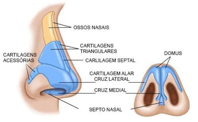 Imagem mostra a anatomia nasal, com suas cartilagens e ossos